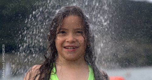 Fototapeta premium Girl smiling under a shower of water in slow-motion at 800 fps, enjoying the...