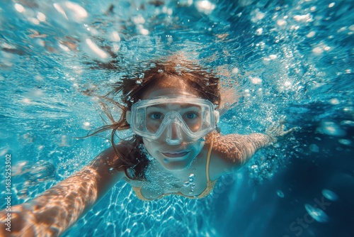 © LimeSky, Fototapeta premium Girl snorkels underwater in a blue pool