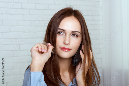 Fototapeta premium Girl speaks by phone and aims pen like a dart