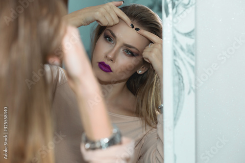 © hbrh, Fototapeta premium Girl squishing pimples in mirror