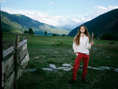 © SHOTPRIME STUDIO, Fototapeta premium Girl standing with a wooden stick in a rural meadow, mountains in the distance and a rustic fence, nature scene capturing outdoor adventure and countryside beauty