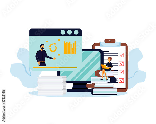© Anastasiia, Obraz premium Girl student studying at home with her laptop with piles of books and pc on the background. E-learning, webinar, online video training, distance education concept. Modern vector illustration.