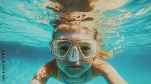© Maria, Naklejka premium Girl swimming underwater in the pool with goggles for scuba diving, look at the camera. Swimming sport school for children.