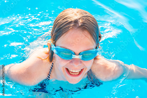 Naklejka premium Girl swims in the pool with glasses for swimming