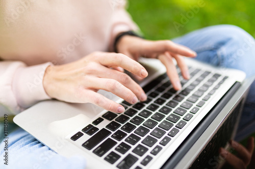 © Ivan Traimak, Naklejka premium girl typing on laptop keyboard with mockup sitting on grass in park