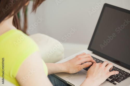 © WavebreakmediaMicro, Naklejka premium Girl typing on laptop sitting on a sofa