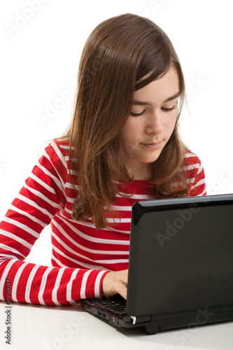 © Jacek Chabraszewski, Naklejka premium Girl using laptop isolated on white background