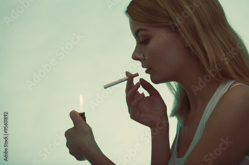 © Voyagerix, Obraz premium Girl using lighter to light cigarette.