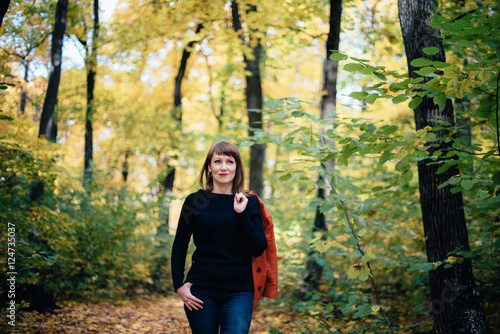 Fototapeta premium girl walking in the autumn yellow wood, maple grove
