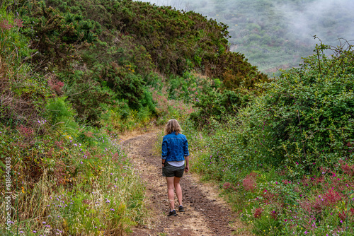 Fototapeta premium girl walking on a sidewalk surrounded by green vegetation