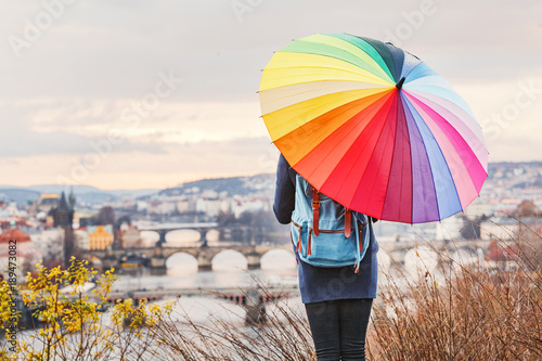 Obraz premium Girl walking with umbrella on rainy day in historical center of Prague, Europe