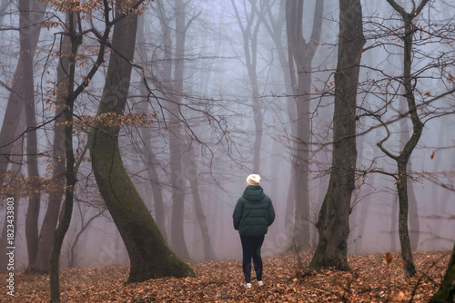 © erika8213, Naklejka premium Girl walks on footpath in dark foggy mystery forest alone.