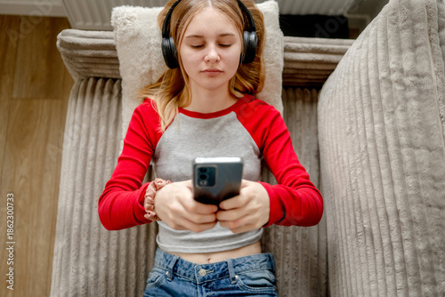 Fototapeta premium Girl Watching Movie On Smartphone With Headphones While Lying On The Couch