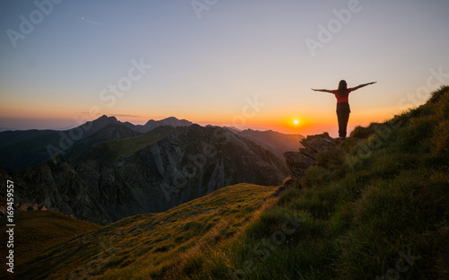 © icephotography, Obraz premium Girl watching sunset in Fagaras mountains
