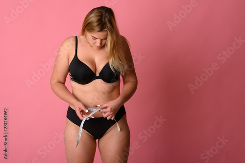 Fototapeta premium girl wearing black bikini measures the size of the waist