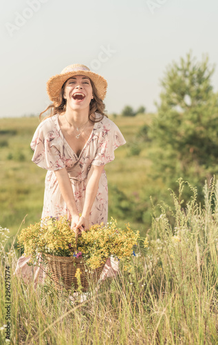© Anna, Obraz premium girl with a basket of flowers and a straw hat in a summer field