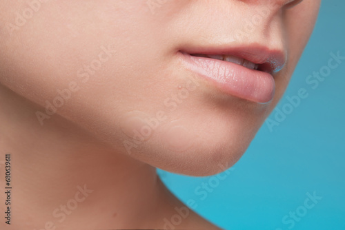 © st.kolesnikov, Obraz premium Girl with acne stick round acne patch on her cheek. Using acne patches for treatment of pimple and rosacea close-up. Facial rejuvenation cleansing cosmetology