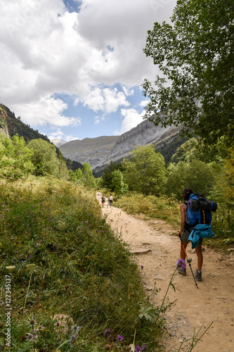 © carbonyte, Fototapeta premium Girl with backpack and walking sticks strolling down a mountain