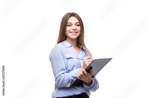 Fototapeta premium Girl with blank over white background