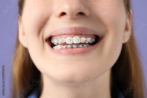 © New Africa, Fototapeta premium Girl with braces on purple background, closeup