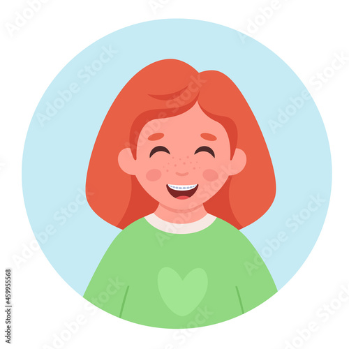 © Amahce, Obraz premium Girl with braces on teeth. Dental care. Vector illustration