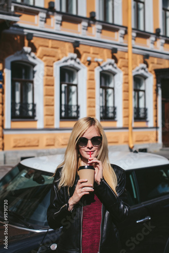Fototapeta premium Girl with coffee on the background of cars and houses