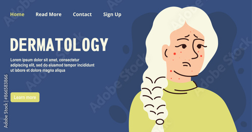 © Natalya Nepran, Obraz premium Girl with dermatology problem banner. Cartoon scene skin problem isolated on white background.