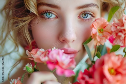 Fototapeta premium Girl with flowers and a mysterious look, vibrant colors