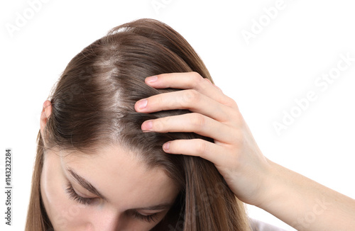 © New Africa, Fototapeta premium Girl with hair loss problem on white background, closeup