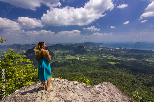 © sergeyonas, Naklejka premium girl with hands up standing on rock at sunset with mountains below