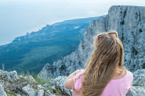 Naklejka premium girl with long blond hair sits on top of Mount Ai-Petri in Crimea with a sea...