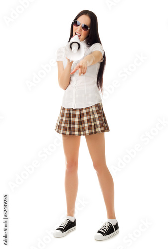 Fototapeta premium Girl with megaphone shows pointing gesture