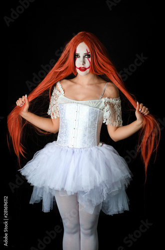 © евгений ставников, Fototapeta premium girl with red hair in clown costume on black background