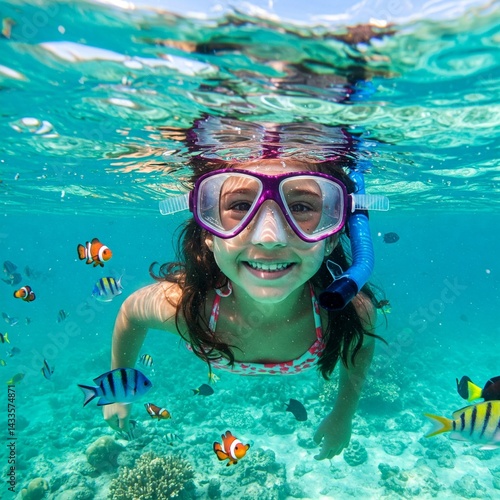 © tartaruga, Naklejka premium girl with snorkel and fishes around