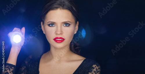 © Vladimir Bikhovskiy, Fototapeta premium girl with the led flashlight in her hands shines straight. . glare of light and dark Studio background. portrait of a beautiful model who looks carefully in the direction of light from the lamp. space