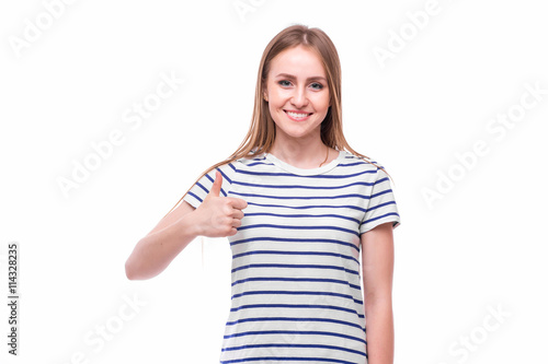 © F8 \ Suport Ukraine, Fototapeta premium Girl with thumbs up on white background. People emotions concept.