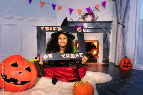 Fototapeta premium Girl with trick or treat frame in Halloween dress sit at home near fireplace...