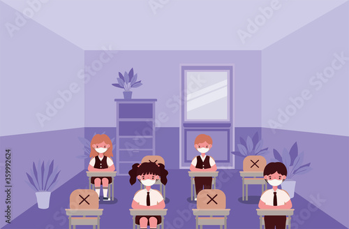 Obraz premium Girls and boys kids on desks with medical masks at classroom design, Back to...