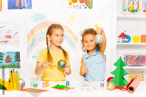 Naklejka premium Girls painting New Year balls for Christmas tree