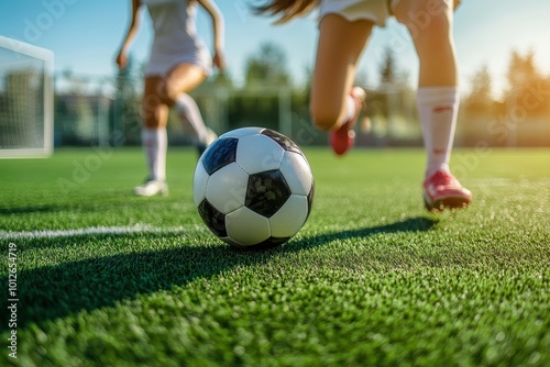 © LimeSky, Fototapeta premium Girls play soccer on astroturf field