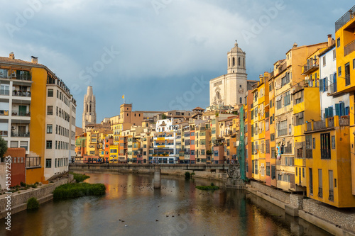 Fototapeta premium Girona medieval city, panoramic from the famous red bridge Pont de les...
