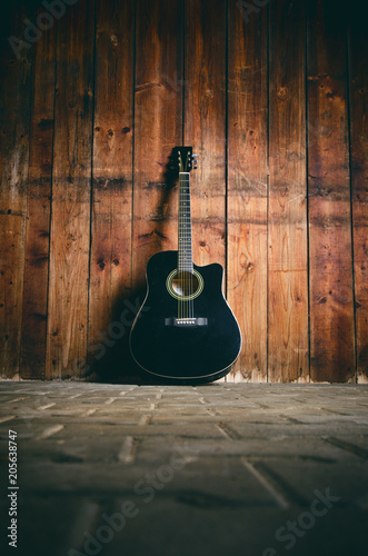 Fototapeta premium Gitara akustyczna na drewnianej teksturze z miejscem na tekst. Koncepcja...