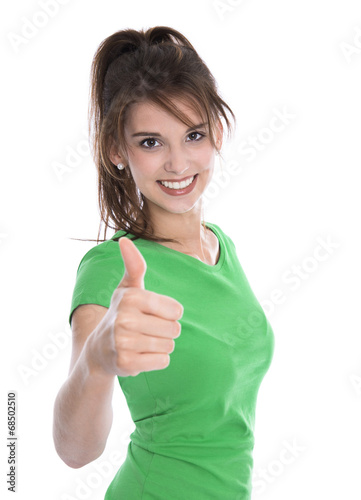 Fototapeta premium Glückliche junge Frau freigestellt in Grün mit Daumen hoch