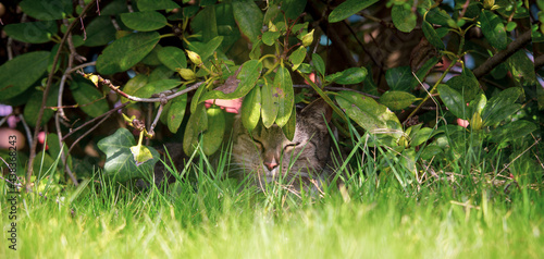 © dfleischhauer, Obraz premium Glückliche Katze unter einem Busch