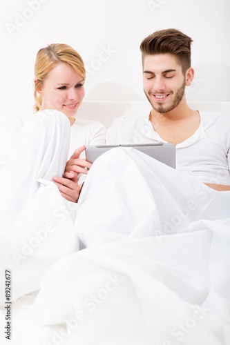 Fototapeta premium Glückliches Pärchen mit Tablet Pc im Bett