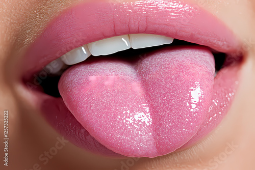 © Jibber , Obraz premium Glänzende Lippen mit herausgestreckter Zunge in Nahaufnahme
