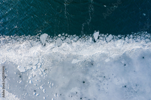 Naklejka premium Glacier Lagoon with icebergs from above. Aerial View. Cracked Ice from drone view. Background texture concept.