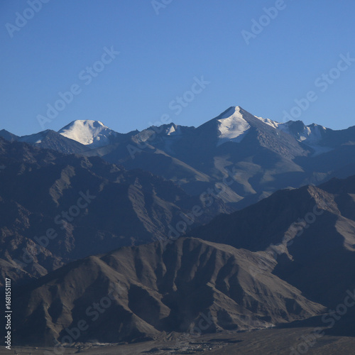 Fototapeta premium Glaciers on high peaks of the Zanskar Range, view from Leh, India.