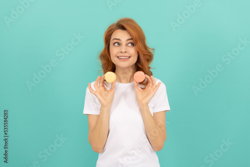 © Olena, Fototapeta premium glad girl hold sweet macaron french cookie on blue background