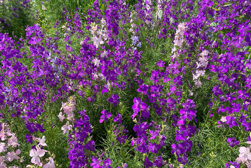 Naklejka premium Glade of flowers. Wild field blooming delphiniums ways in the wind. The lawn is covered with a beautiful carpet of purple, lilac and blue wildflowers. Close-up of a summer day